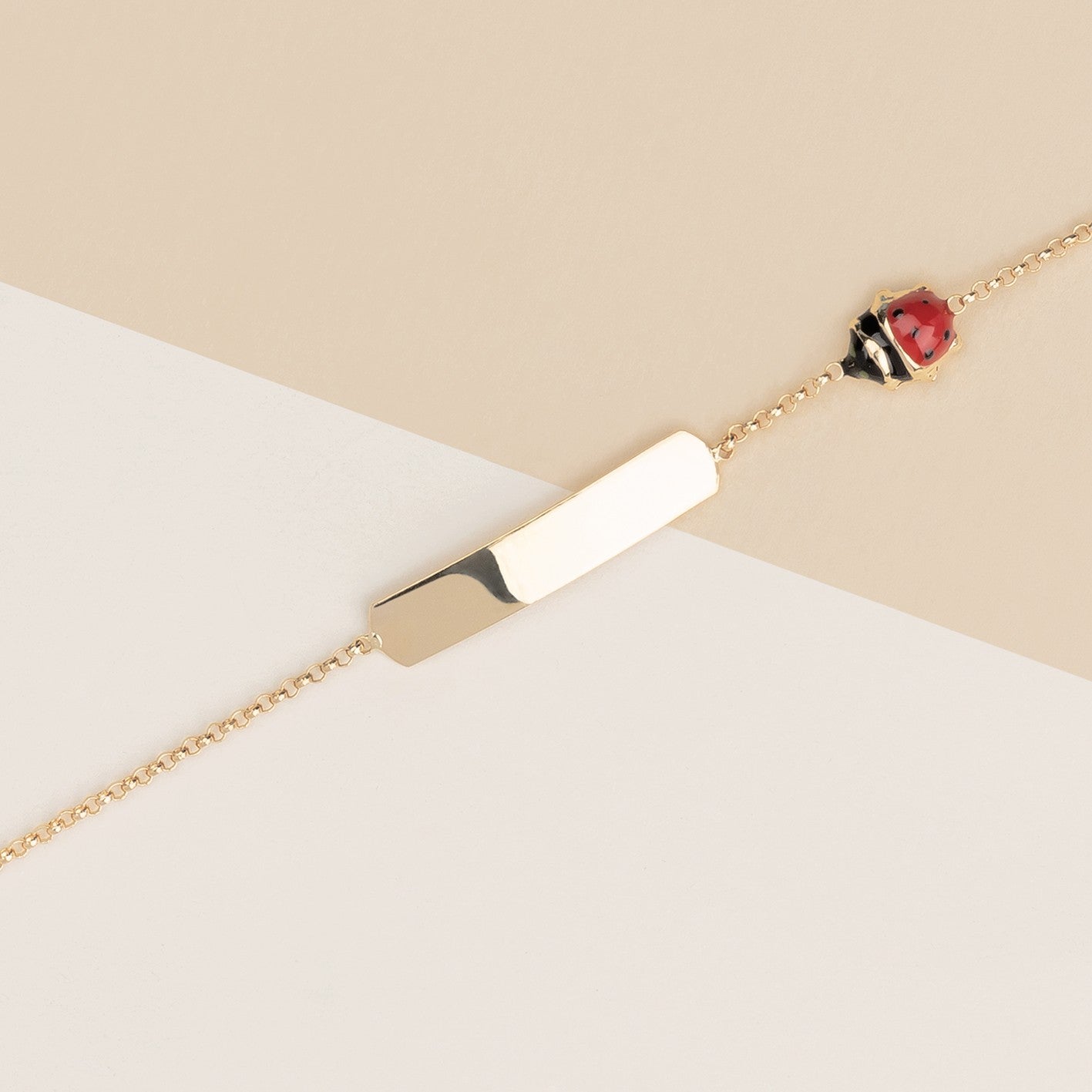 Bracciale bambino/a 1 coccinella smaltata e targa in oro giallo. Doppia possibilità di chiusura. - Peso: 1,6 g