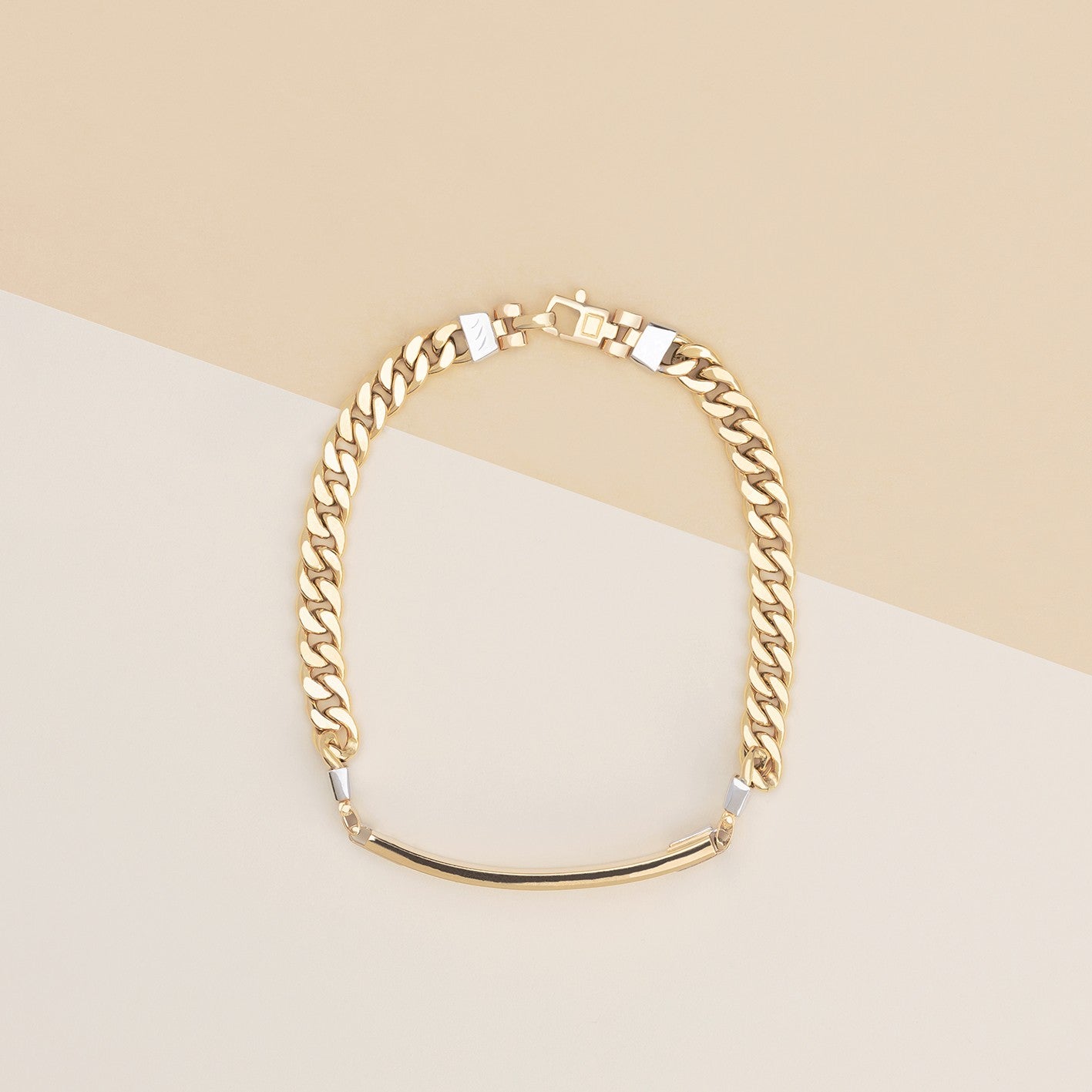 Bracciale uomo maglia groumette e targa centrale, realizzato in oro giallo ed innesti in oro bianco. - Peso: 10,3 g