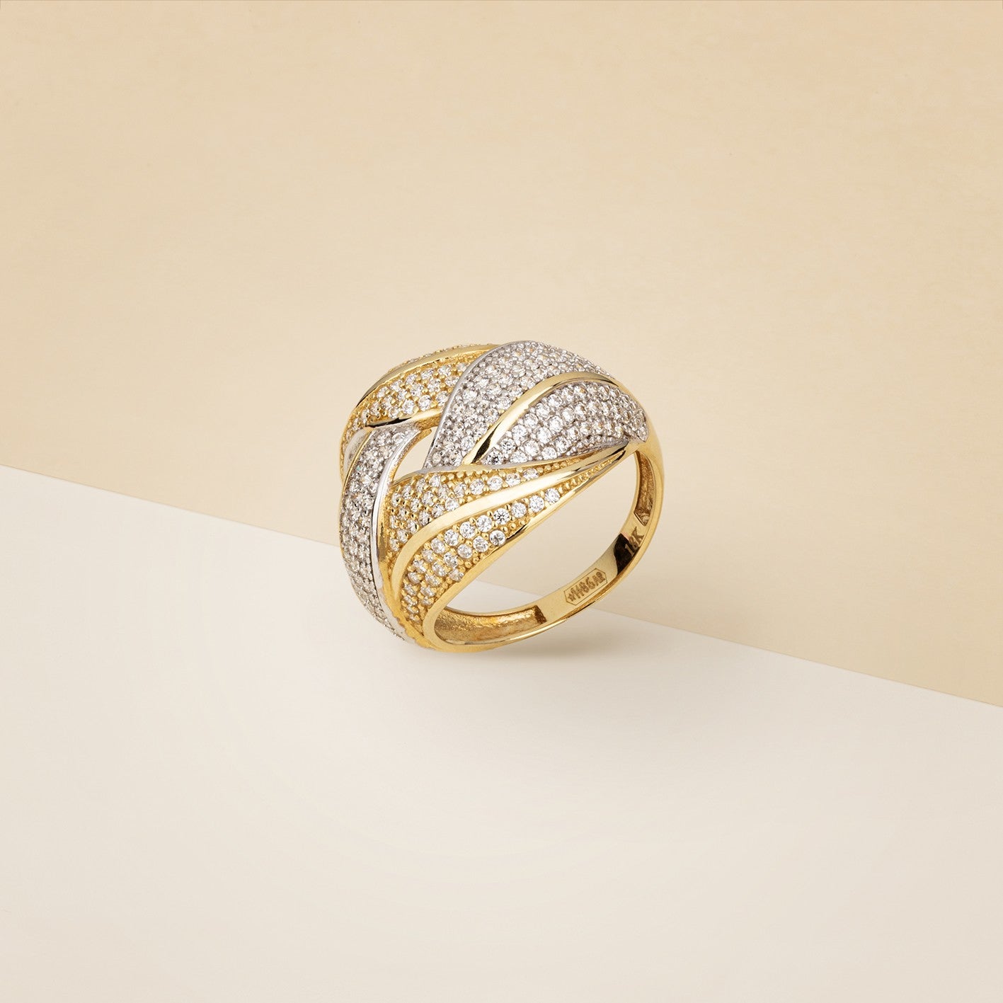 Anello donna realizzato in microfusione, con zirconia, forma intrecciata, in oro bicolore. - Peso: 7 g