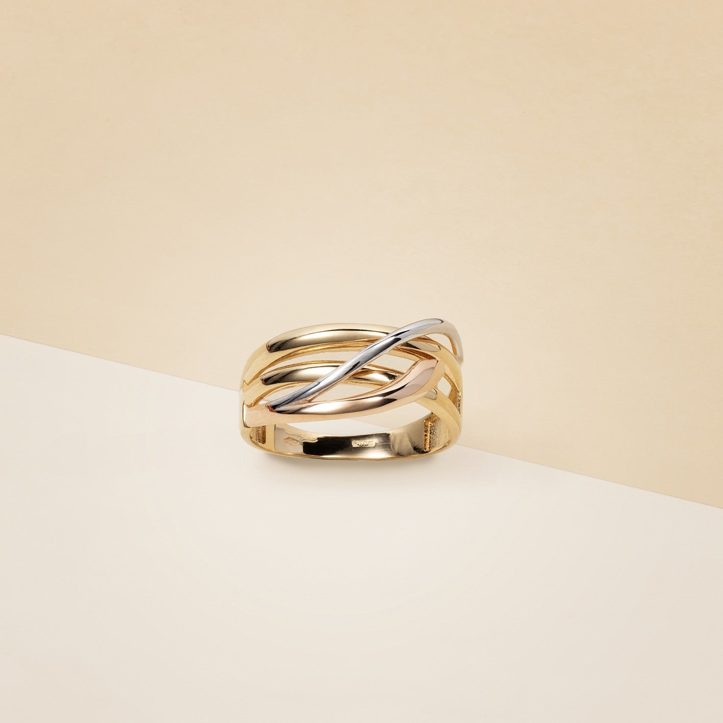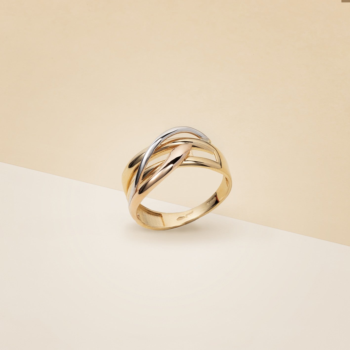 Anello donna ad intreccio, realizzato in microfusione, in tre colori d'oro. - Peso: 4 g
