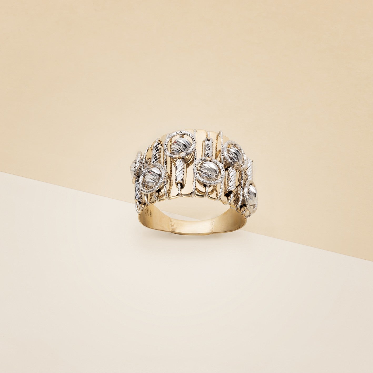 Anello donna a fascia, con elementi a sfera diamantate, in tre colori d'oro. - Peso: 5,2 g
