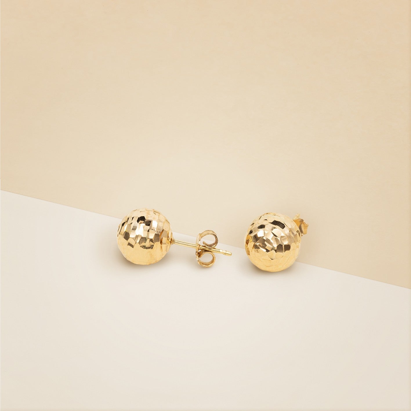 Orecchini donna a sfera, realizzati in oro giallo, effetto faccettato e chiusure a vite. - Peso: 2,8 g