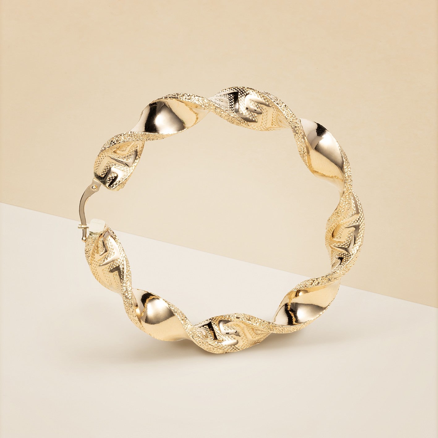 Orecchini donna cerchio torchon con disegno greca, effetto lucido e satinato. Diametro 5 cm. - Peso: 9,2 g