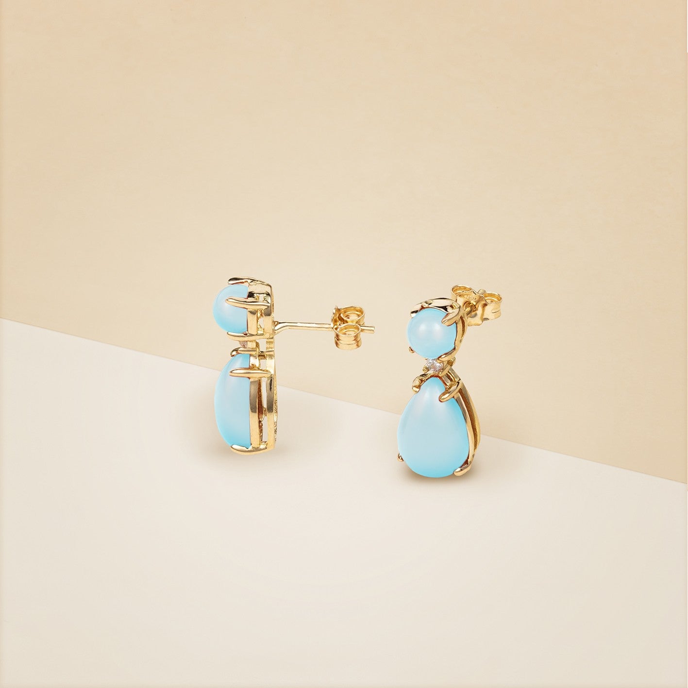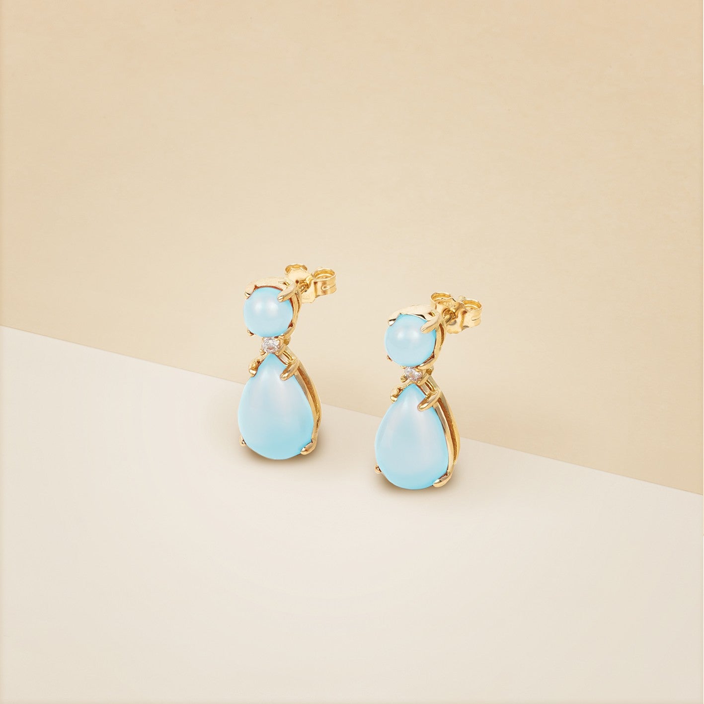 Orecchini donna a goccia, realizzati in oro giallo e corallo turchese, chiusura a vite. - Peso: 4,1 g