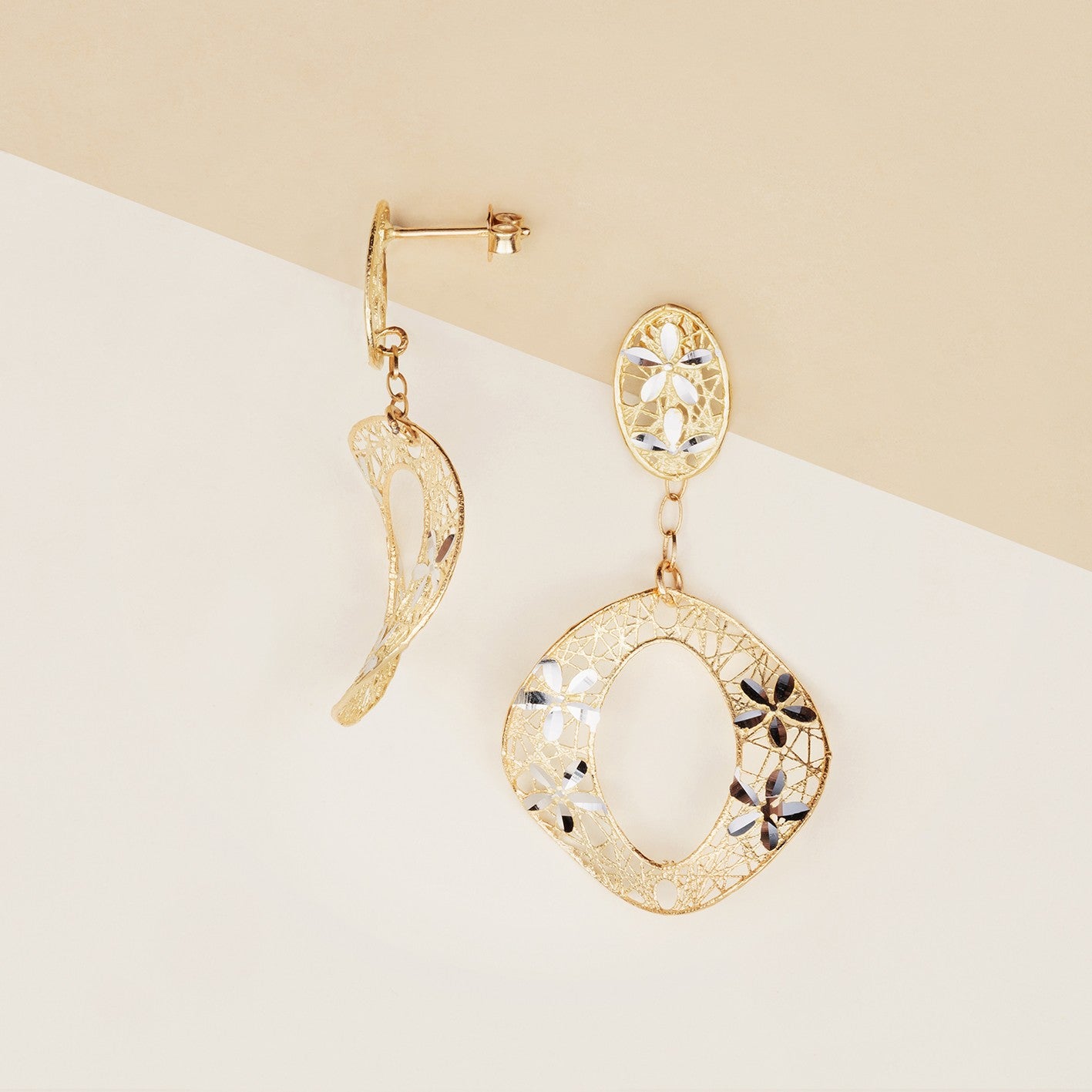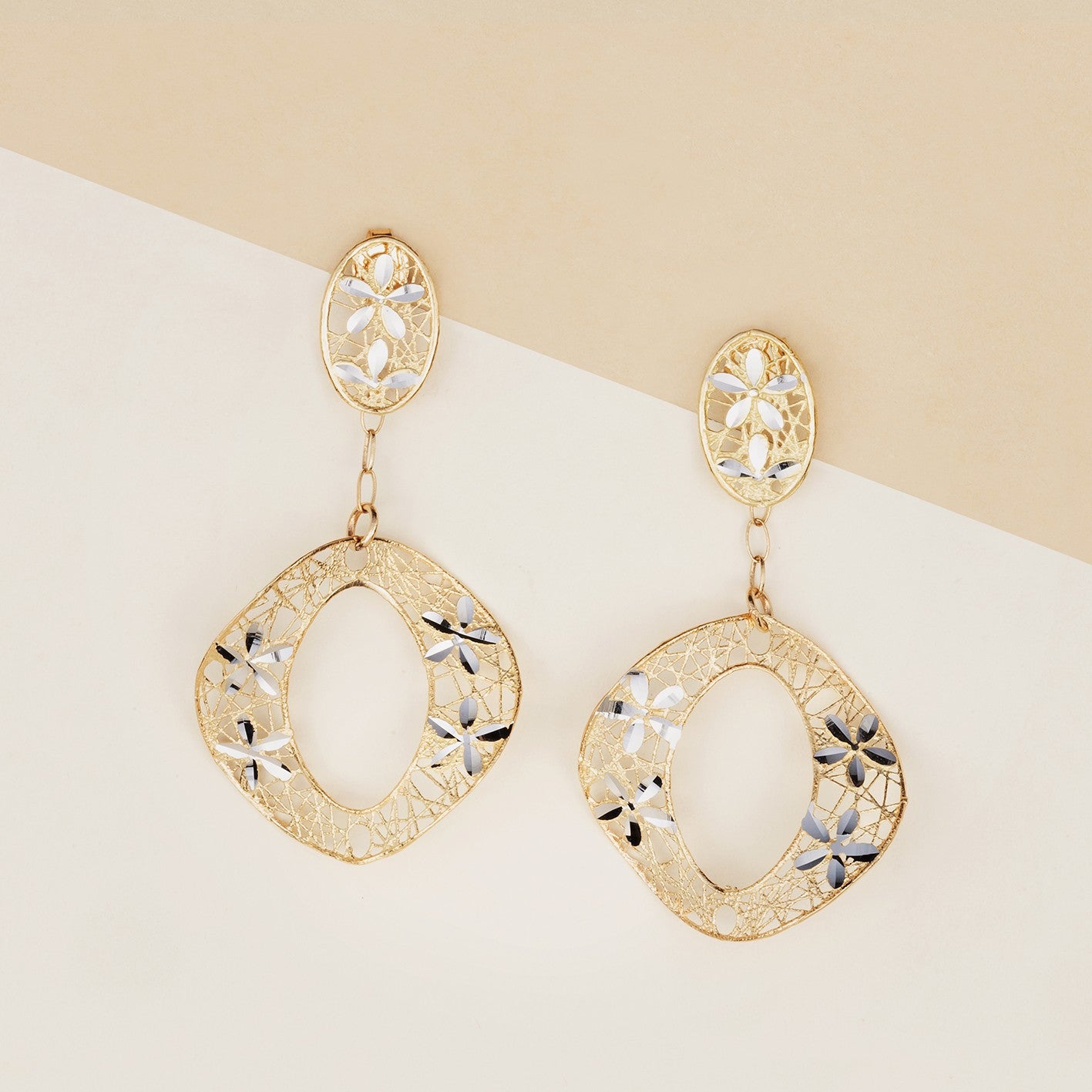 Orecchini donna pendenti modello CLEO, lavorazione traforata, realizzati in oro giallo ed inserti in oro bianco. Chiusura a vite, lunghezza 4.5 cm - Peso: 4,2 g