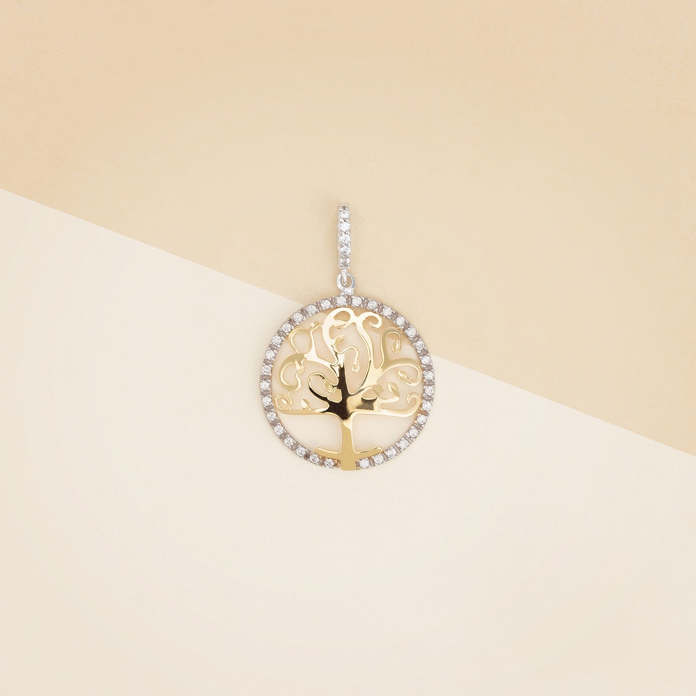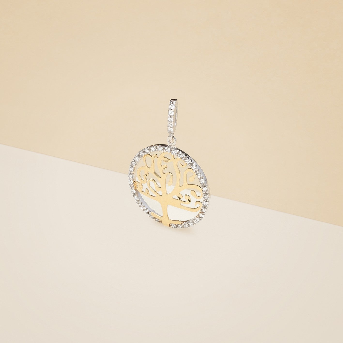 Pendente albero della vita, realizzato in oro giallo ed oro bianco,contromaglia e contorno zirconati, diametro 2 cm. - Peso: 1,9 g