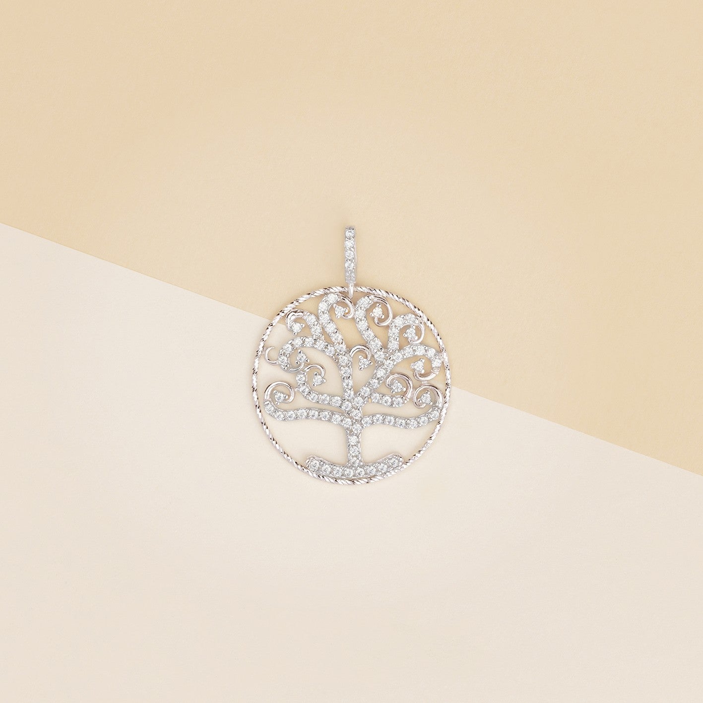 Pendente albero della vita, realizzato in oro bianco e zirconi bianchi, diametro 2.4 cm - Peso: 3,3 g