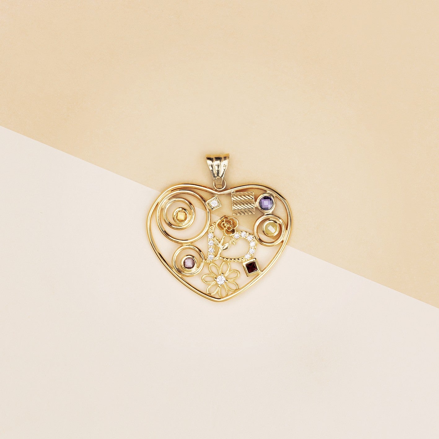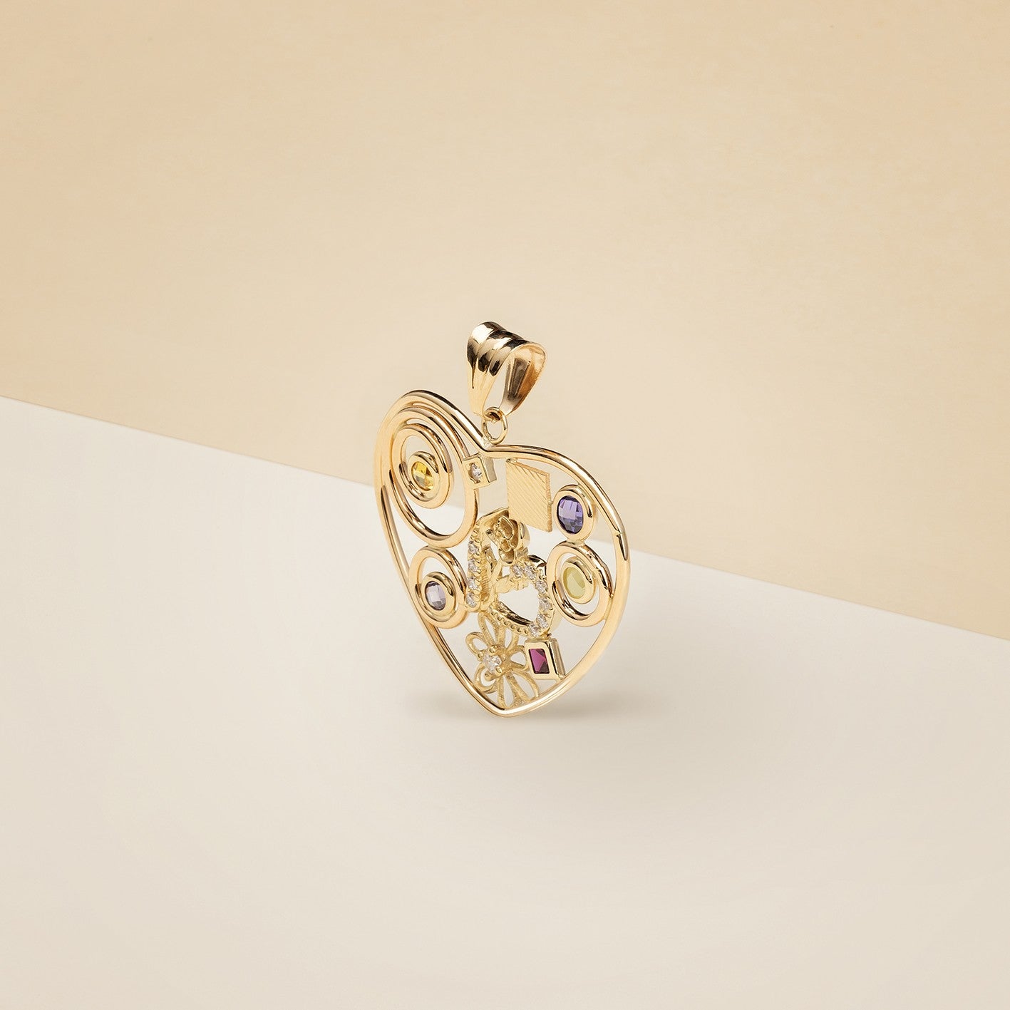 Pendente donna cuore fantasy, realizzato su base traforata in oro giallo e pietre colorate incastonate. Larghezza 1.5 cm - Peso: 5,3 g