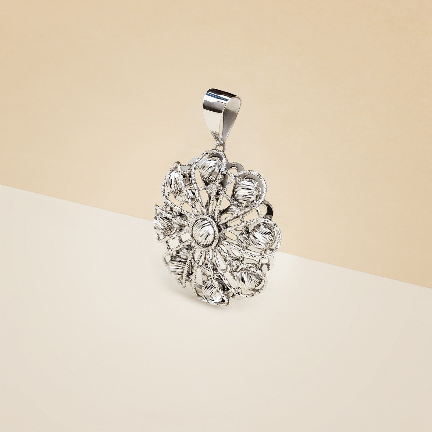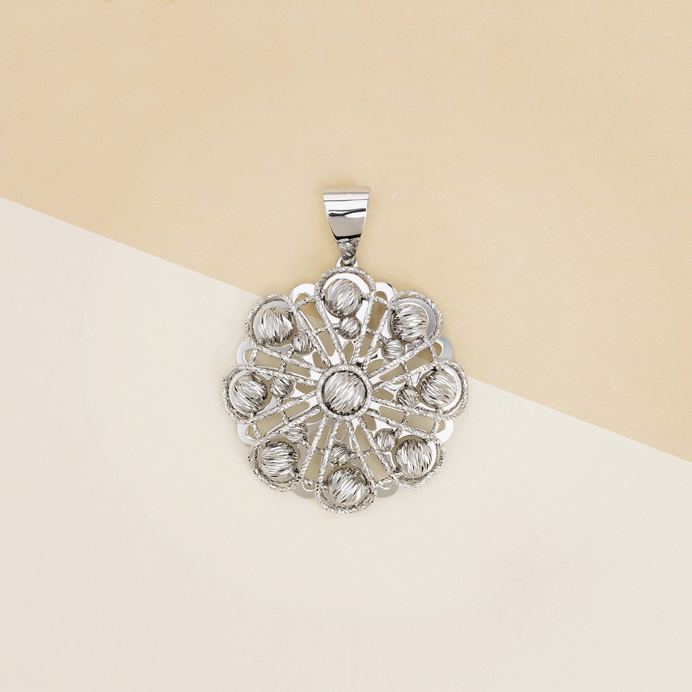 Pendente donna fiore fantasy, realizzato in oro bianco e palline faccettate. Diametro 3 cm. - Peso: 7,5 g