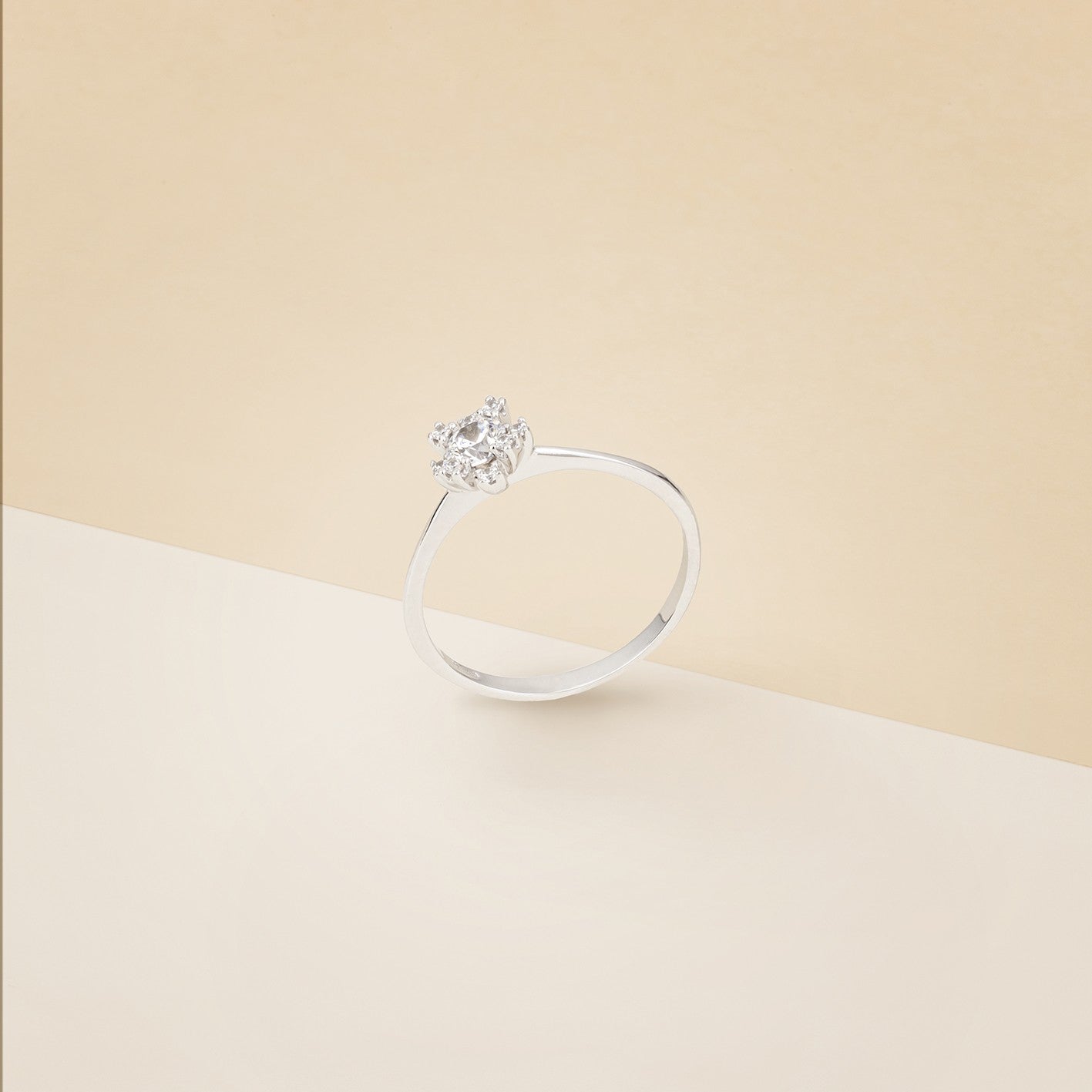 Anello donna, modello solitario, magic, struttura in oro bianco. - Peso: 1,9 g