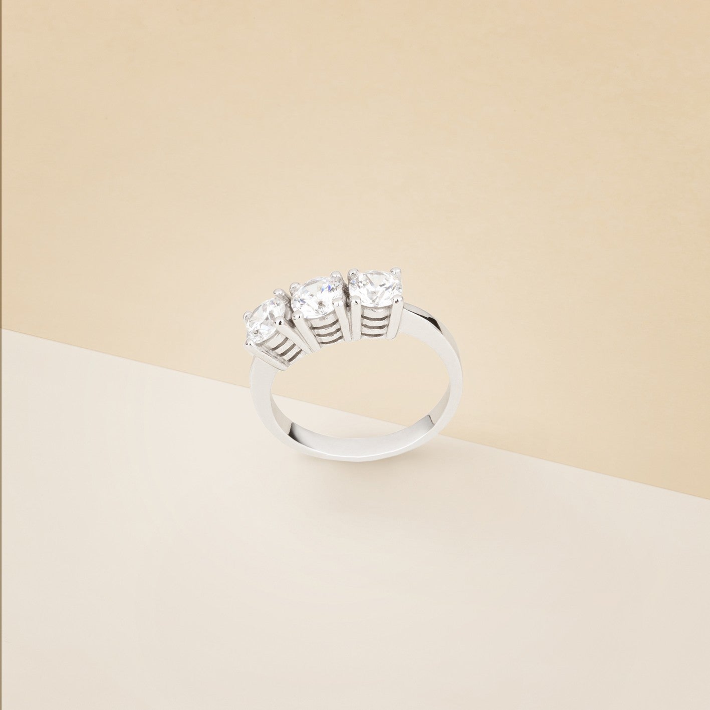 Anello donna, modello trilogy, struttura a torre, in oro bianco e zirconi. - Peso: 4,5 g